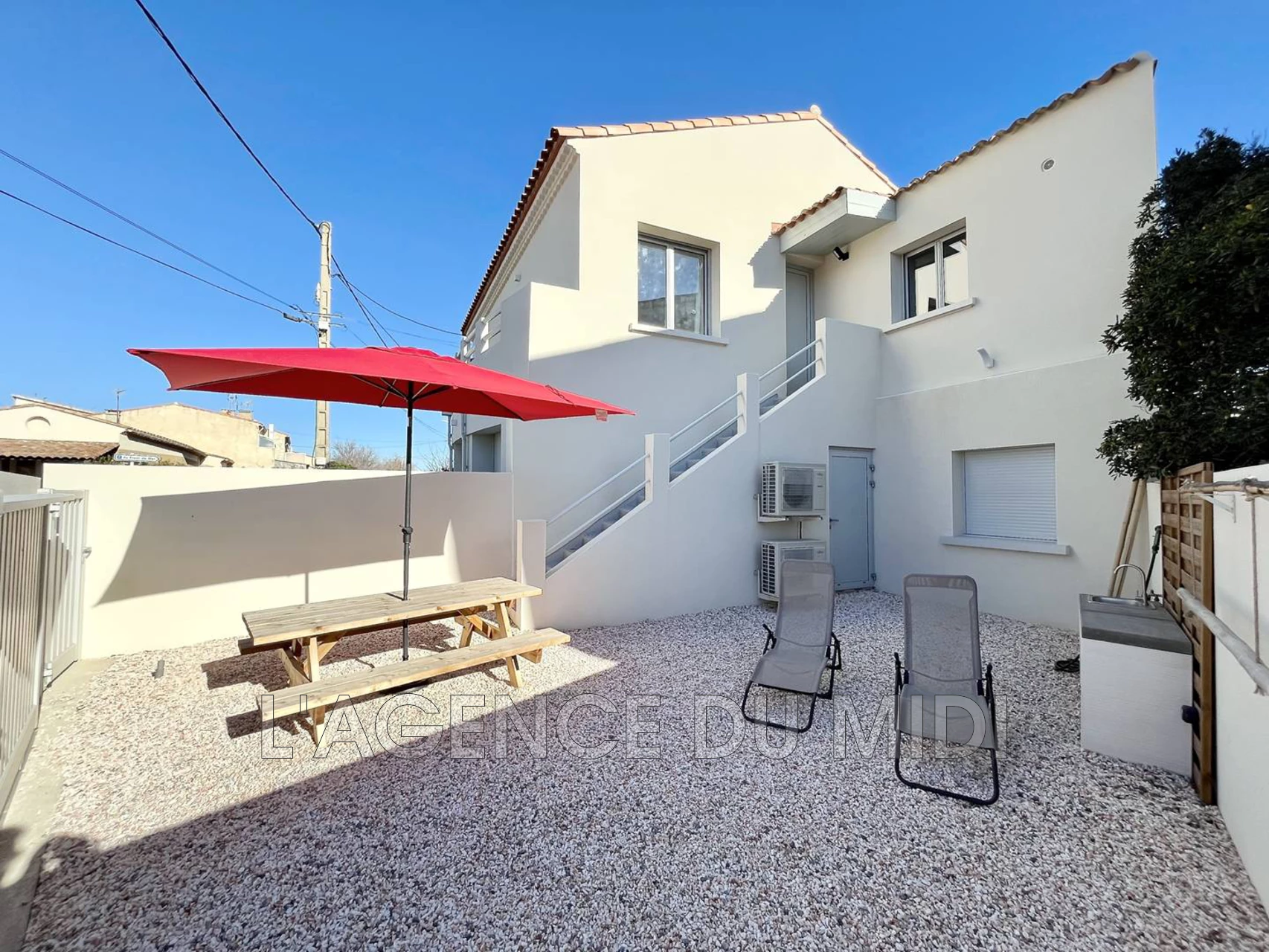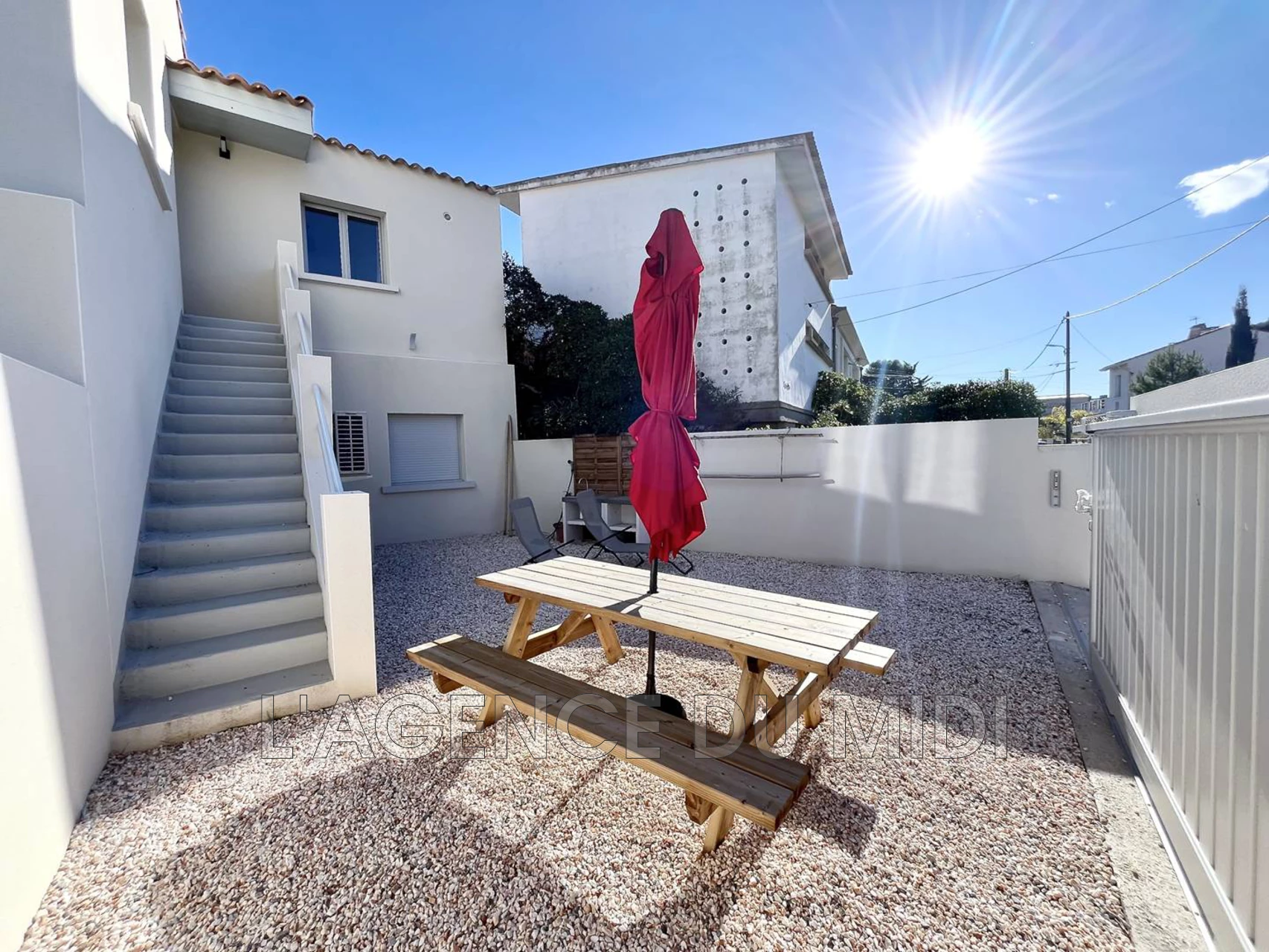 - Deux extérieurs : un balcon accessible par la pièce à vivre avec une petite table pour y boire le café ou l'apéritif, et une cour située sur le côté de la maison, accessible par les escaliers extérieurs (possibilité d'y stationner un véhicule)