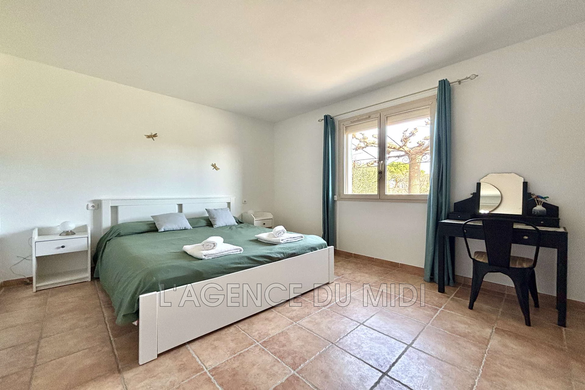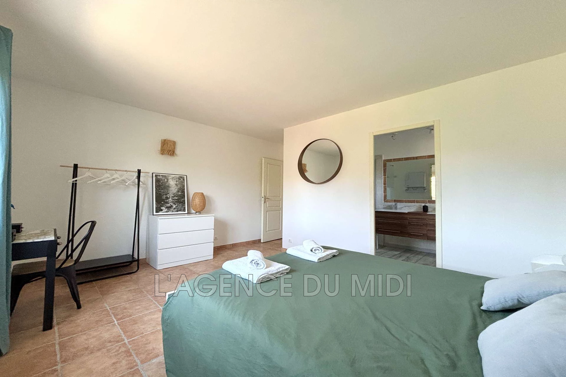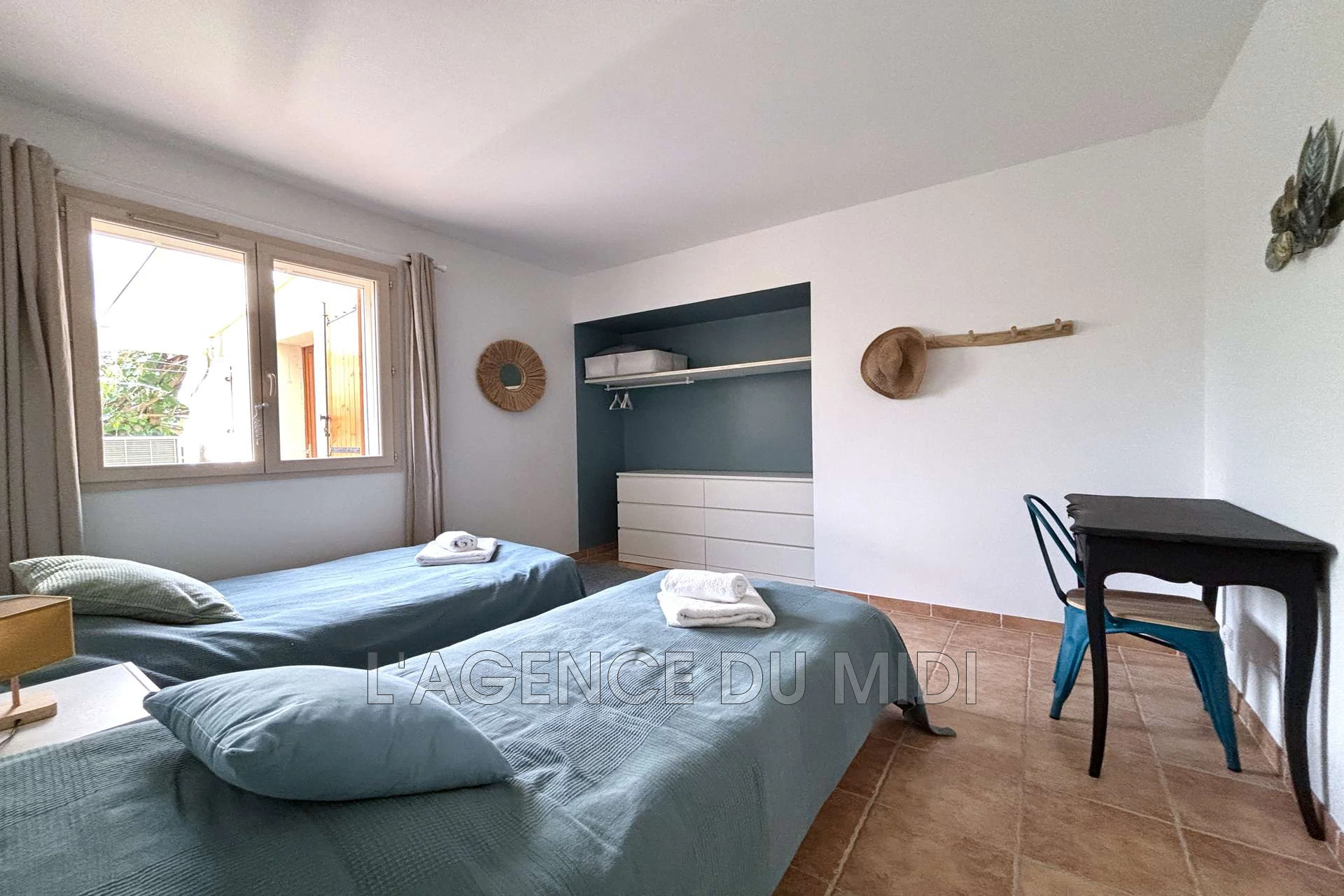| Chambre 4 | 14 m² | 13.5 m² - 2 lits 90x190 (lits superposés) et 1 lit 90x190. Une commode, un bureau avec une chaise, un meuble étagères, un chevet avec 2 lampes. 2 couettes et 3 oreillers. Climatisation gainable. | |||