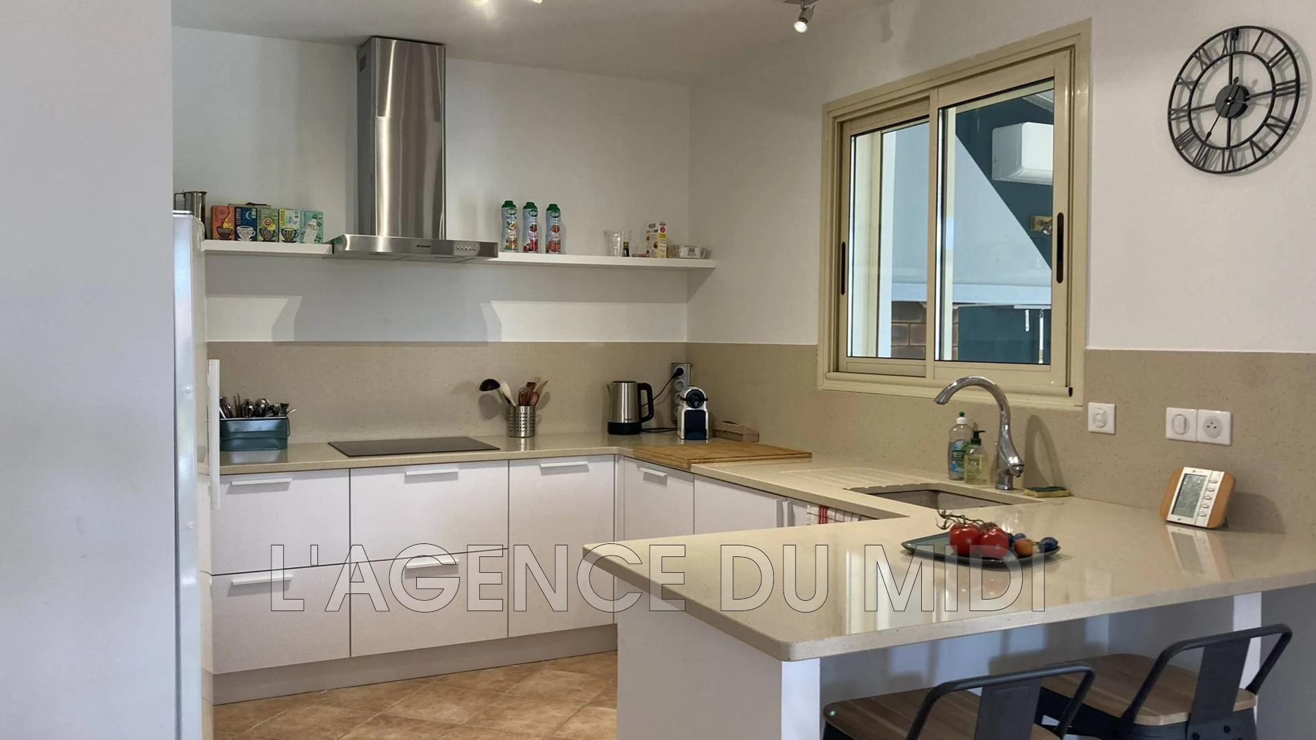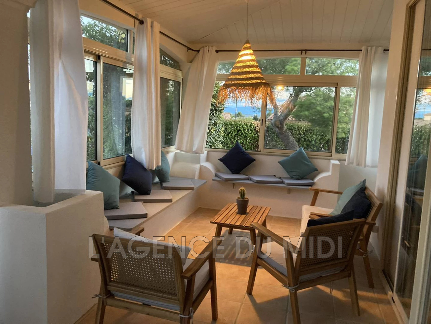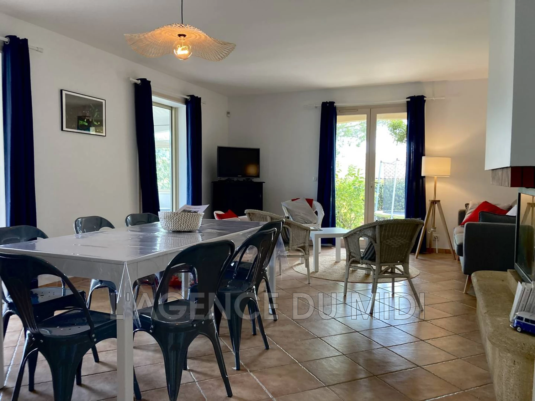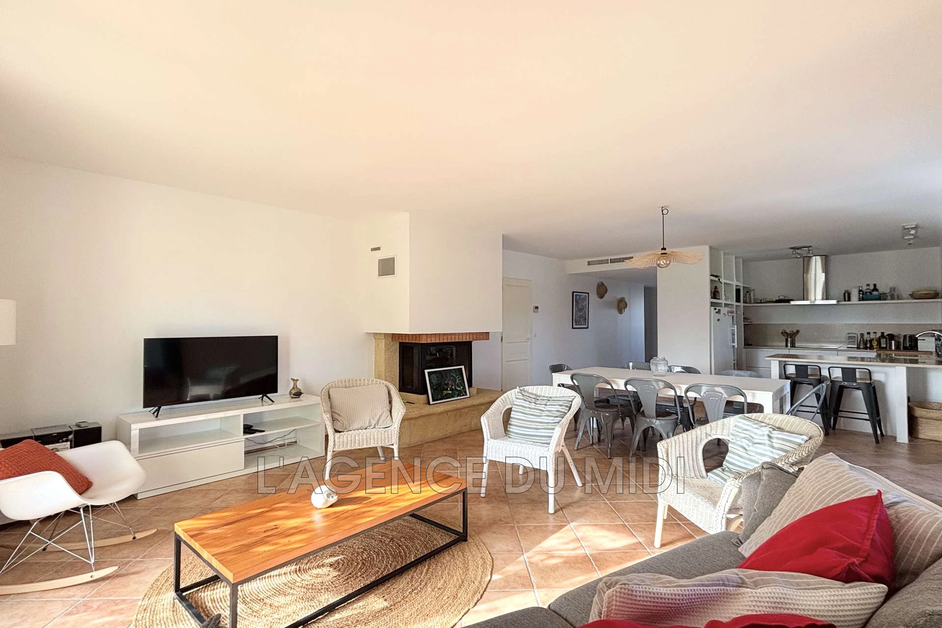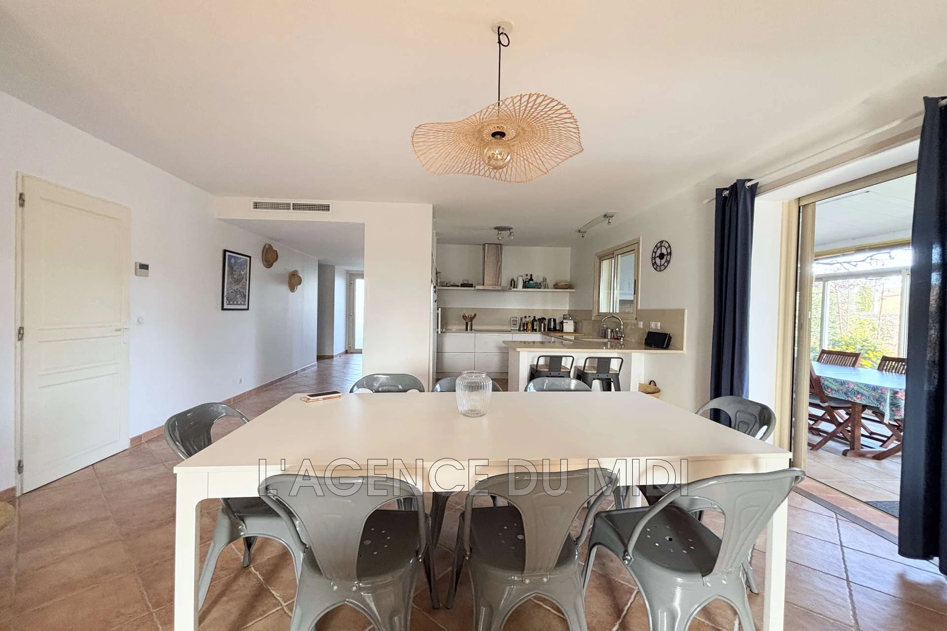 Elle se compose d'une grande pièce de vie lumineuse avec cuisine entièrement équipée, salle à manger et salon donnant sur une véranda permettant l'accès au jardin et à la piscine.