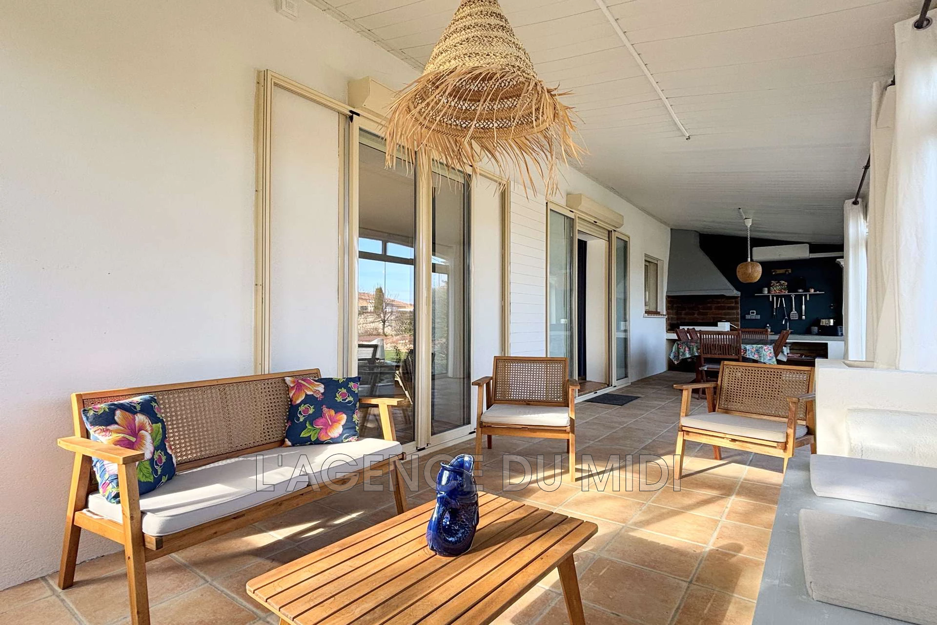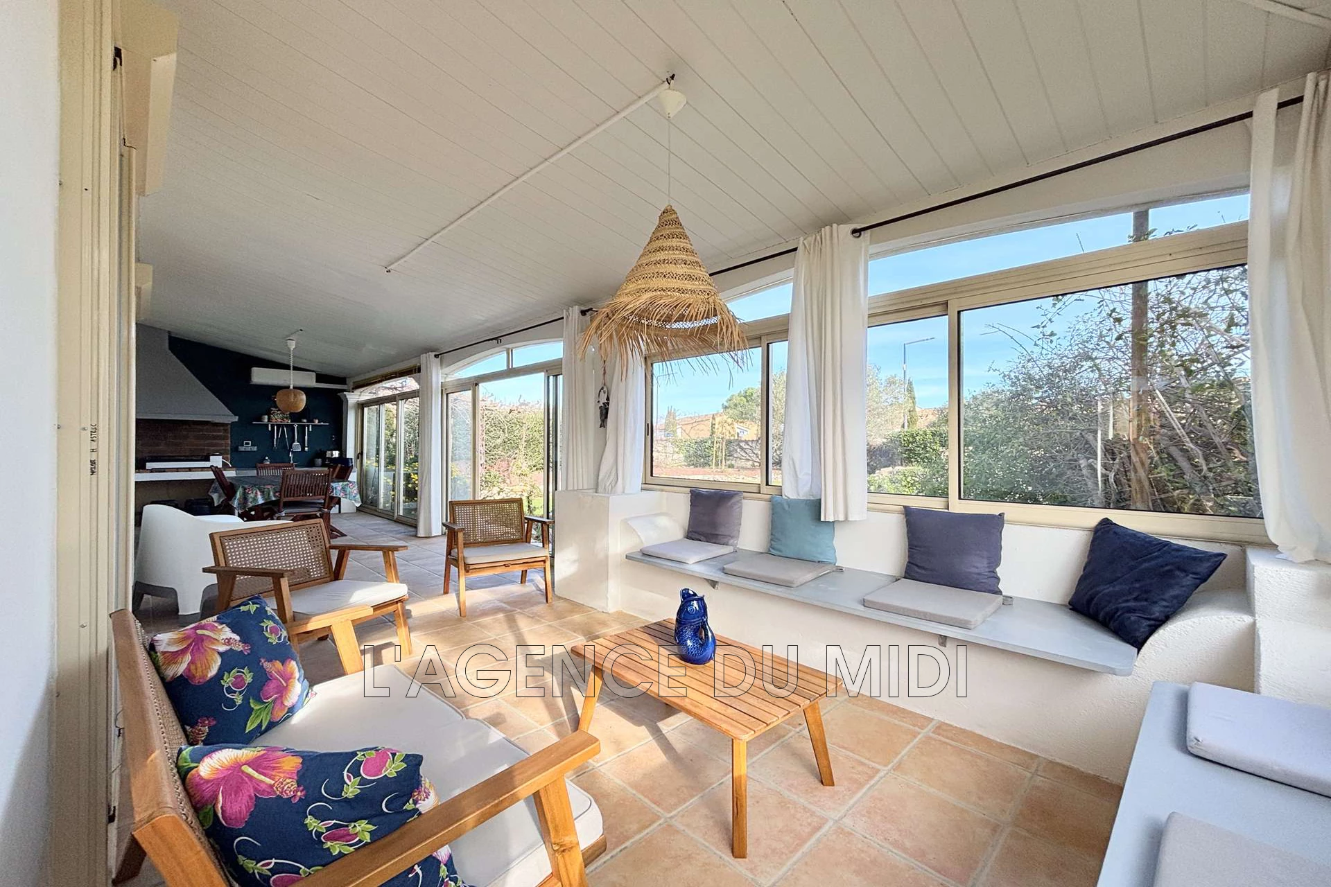 | Veranda | 27 m² | 27 m² - 1 table pour 6 personnes, coin salon avec bancs, coussins, fauteuils, petit canapé et table basse. Cuisine d'été avec plancha et évier. Climatisation avec split. | |||